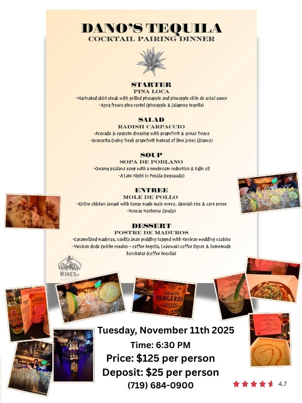 Since December 2021, “Wines of Colorado” has offered our customers special pairings with the best Colorado wines and/or spirits. Based on your feedback, we plan to continue to have special dinners as we move into the Fall. Again, reservations are required and if the past is any indication of the future, we encourage you to sign up early!